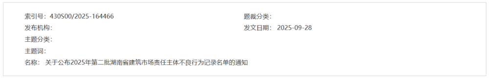 關(guān)于公布2025年第二批湖南省建筑市場責(zé)任主體不良行為記錄名單的通知發(fā)表時間:2025-09-28 09:23